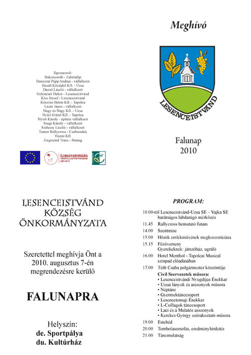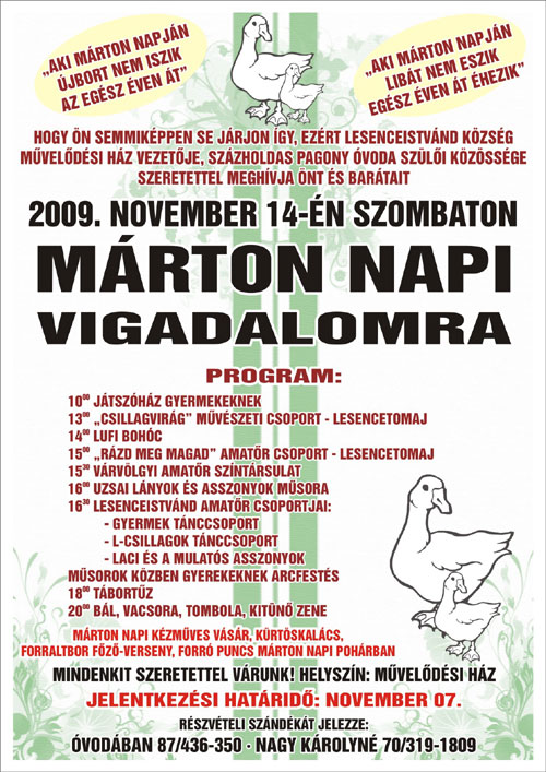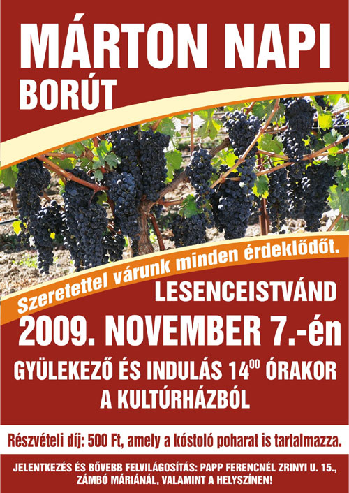 2009. szeptember 04-05-én kerül megrendezésre a XV. "Lesencéktől a Balatonig" Szüreti Felvonulás és Fesztivál. Az idei évben a központi rendezvénynek Lesenceistvánd ad otthont. Mindenkit szeretettel vár a rendezőség! Bővebb információkért kattintson a http://www.szuretifelvonulas.hu/ oldalra!